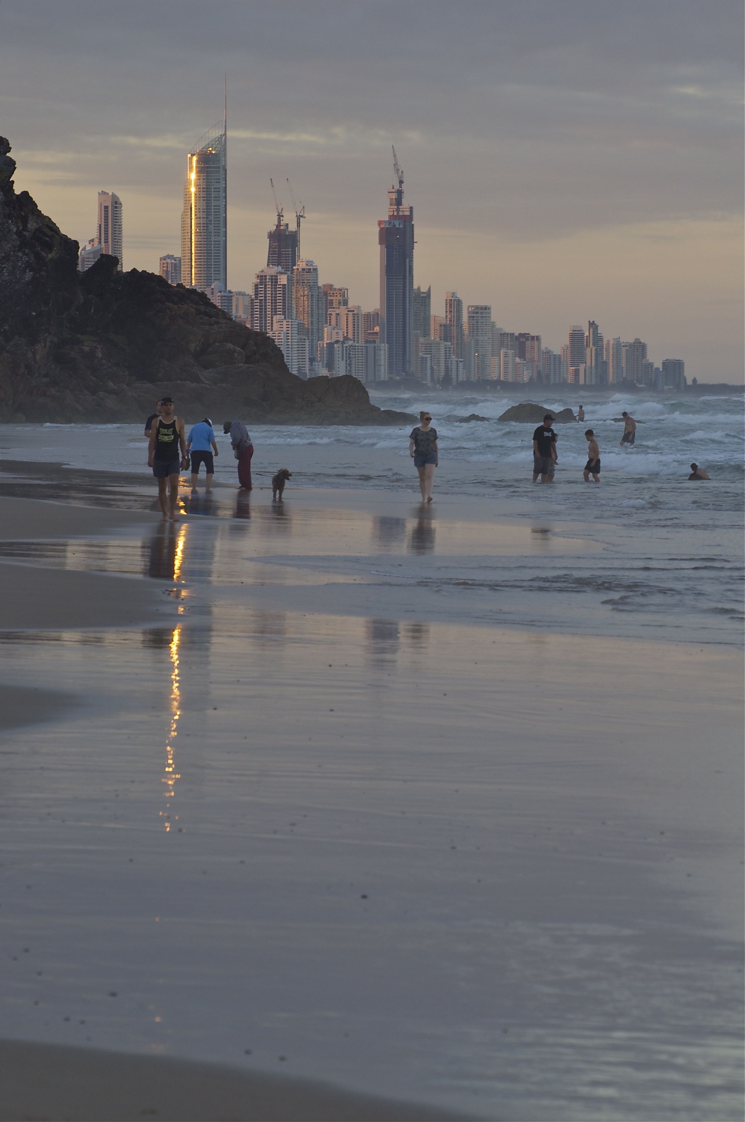 Moving now from the winter to the summer - in Queensland, Australia. The residential highrise apartments of Surfers Paradise glisten in the setting sun (shining from the left side of the photo). This photo was taken from Burleigh Heads beach - a few kilometers to the south - where the sun had just set behind the bluff.