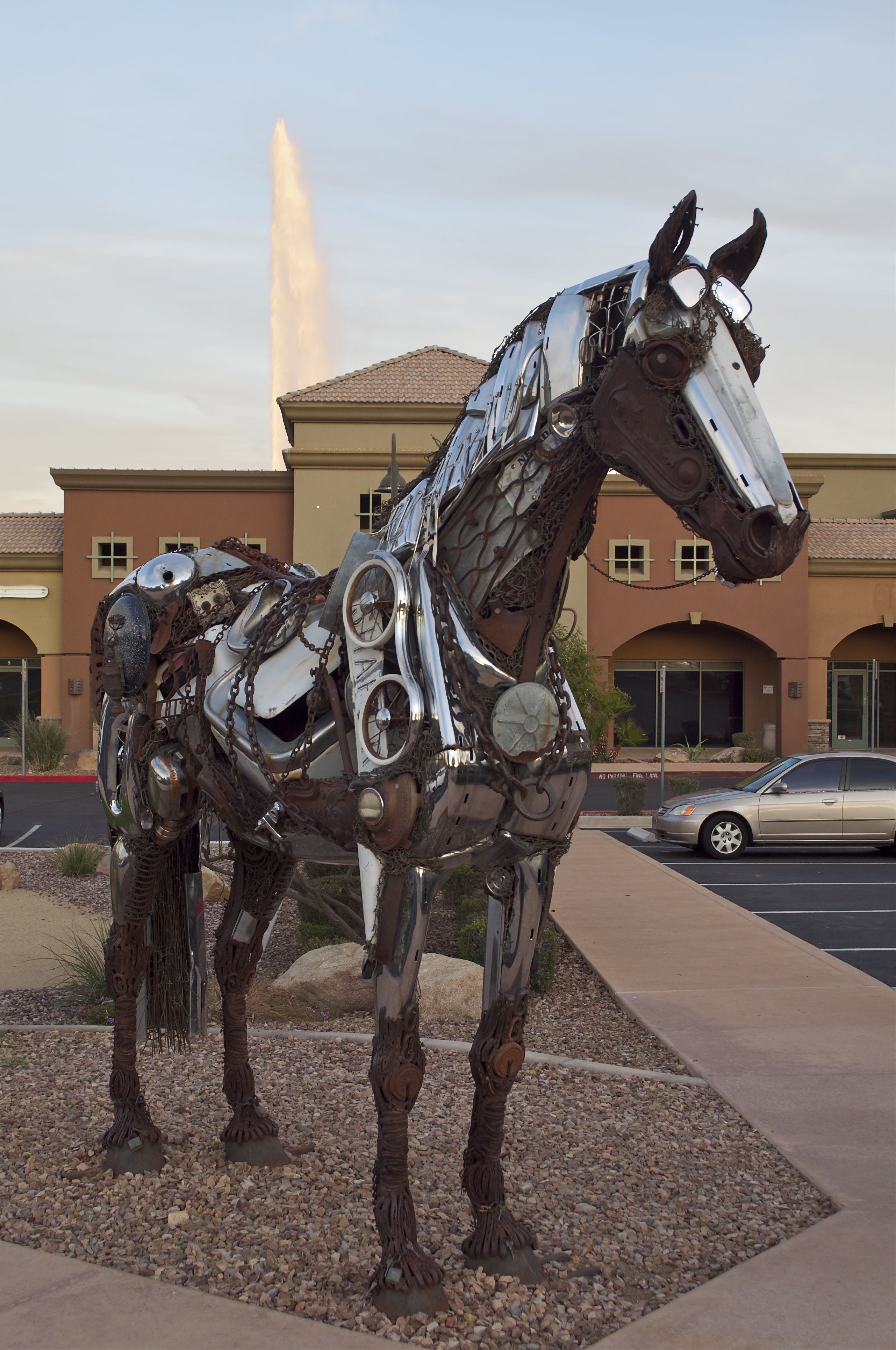 An interesting metal horse statue, Fountain Hills. (The town's famous eponymous fountain is behind.)